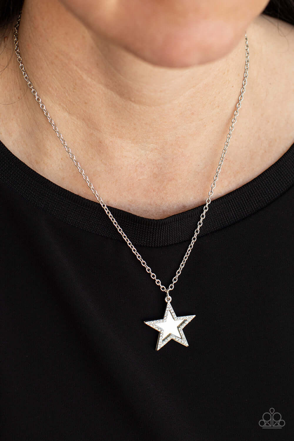 A white rhinestone encrusted silver star delicately overlaps with a shiny silver star below the collar, creating a sparkly patriotic pendant. Features an adjustable clasp closure.