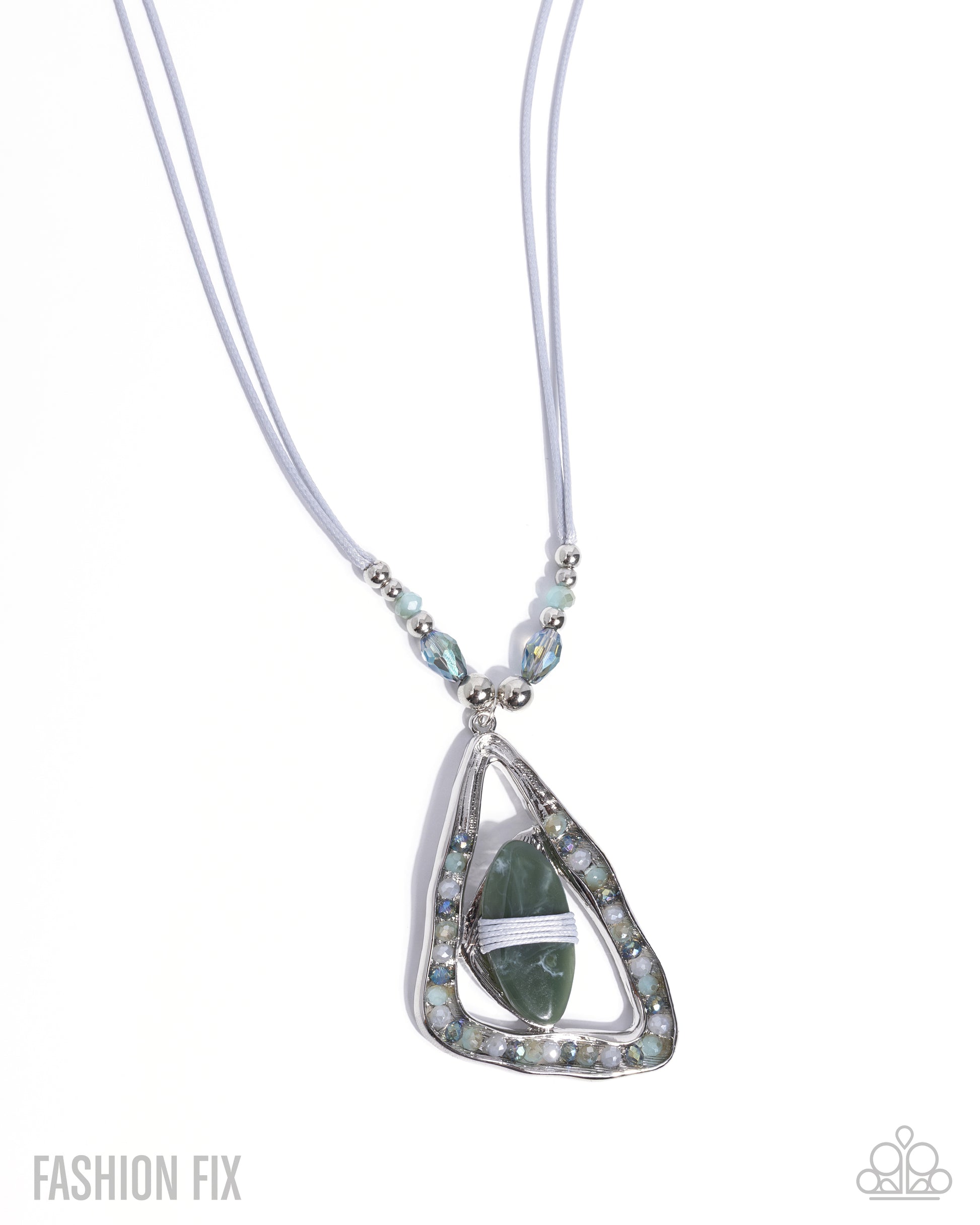 Infused along layers of soft gray cording, a collection of silver, and faceted round green and oval UV-shimmery beads creates an effortlessly earthy foundation for this coastal-inspired statement. An oversized, freeform triangular silver pendant featuring a polished green stone wrapped in gray cording swings from the center of the design, framed by a border of additional UV-shimmery beads in multicolored hues that shimmer with every turn, for a bohemian finish. Features an adjustable clasp closure. As the stone elements in this piece are natural, some color variation is normal.